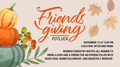 Ladies, gather your friends for an evening filled with food and friendship at our Women's Ministry Friendsgiving Potluck on November 15th at 5pm in the Kid's Wing! Bring your favorite Thanksgiving dish - sweet or savory - along with its recipe. We can take pictures of each other's recipes so only one recipe per dish is needed. Let’s celebrate the blessings of community and the goodness of God together.